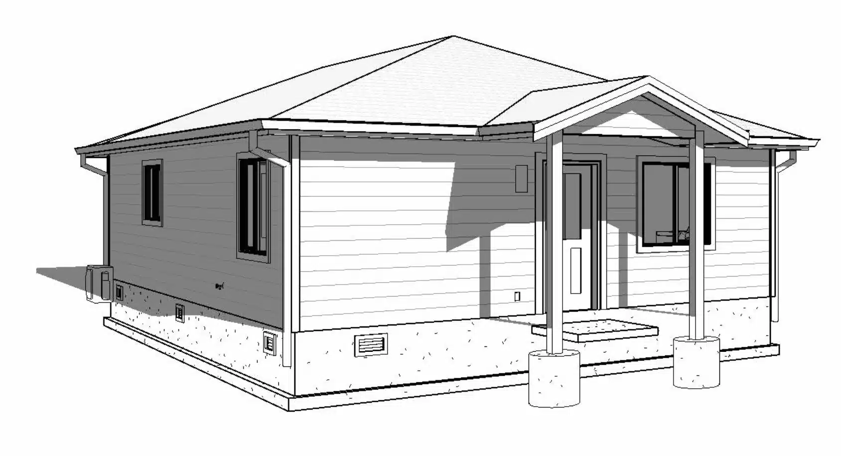 Front exterior of the Coval Homes Hemlock traditional PNW farmhouse plan, with white board-and-batten siding, black roof accents, and wide covered porch designed for flexible small-home living.